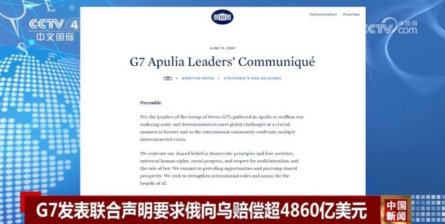 至15日正在意大利南部进行七国集团峰会6月13日。视台等多家媒体报道据“今日俄罗斯”电,日揭晓团结声明G7诱导人14,持乌克兰重申支,胜过4860亿美元的吃亏并央浼俄罗斯向乌克兰补偿。