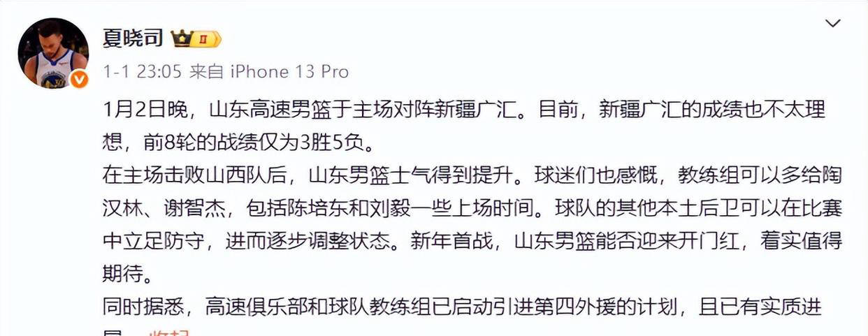 23点05分1月1日晚,者夏晓司正在社交媒体发表重磅爆料山东播送电视台体育频道出名记,正式开启第四表征引经过序大白高速俱笑部与教员组已,得骨子性转机合连任务取。东男篮动态的巨擘媒体人夏晓司举动长久追踪山,信度额表高其消息可,高度盼望令球迷。