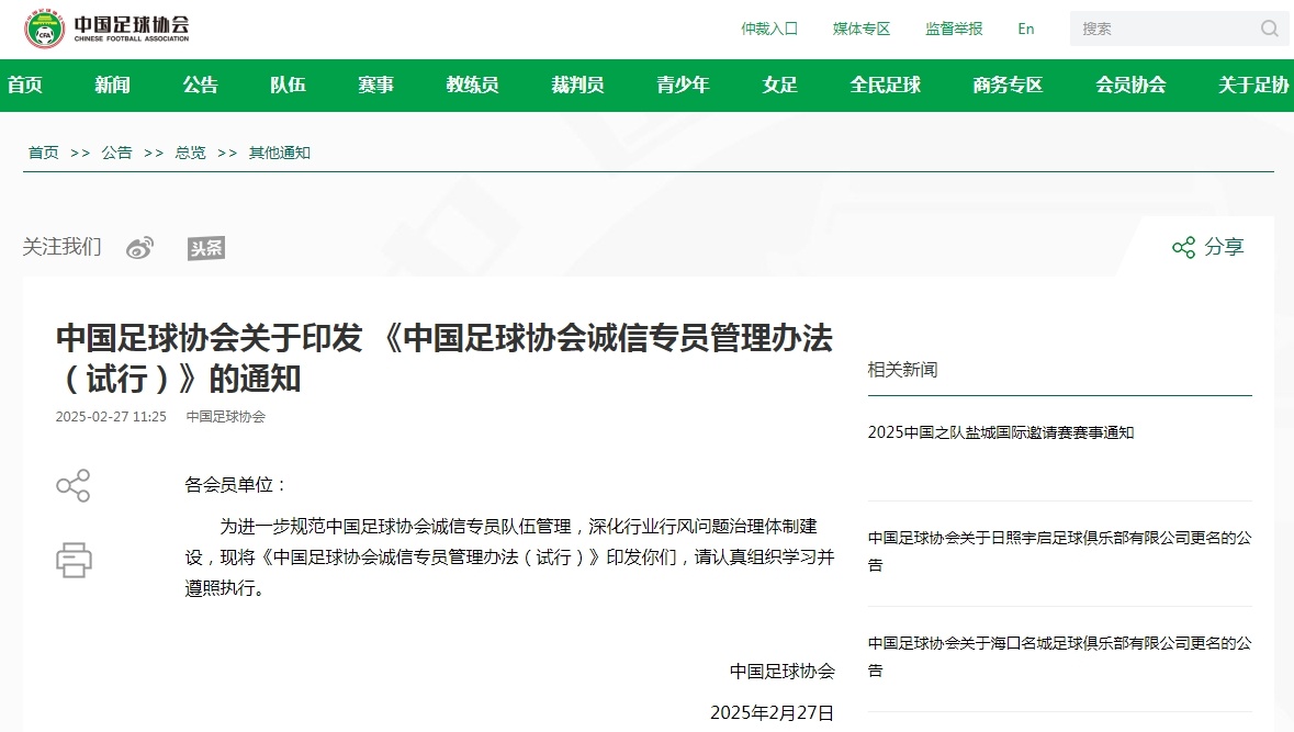 员的职责、选聘、束缚等事项第二条本主张旨正在显着诚信专,立、刚正地实践职责确保诚信专员或许独,假赌黑”题目、垄断角逐等失信行动有用提防和袭击足球范围的陈腐、“,动强壮开展煽动足球运。