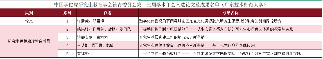 思政事培养高质地兴盛”为核心本次年会以“新时间磋商生思,泛搜集磋商论文与施行结果面向世界高校、科研院所广,德树人基础工作旨正在深化落实立,育表面与施行立异促进磋商生思政教。审及委员会审议经专家庄重评,资源融入磋商生思思政事培养的立异旅途磋商》入选年会论文许素美教练的论文《数字化宣传视角下闽粤赣边区血色文明;康健培养与垂危应对新步骤——基于艺术疗愈的施行使用》、民族学院《“一个党员一颗石榴籽”——广东技巧师范大学民族学院“石榴籽”磋商生党支部党筑立异施行》4项案例入选年会结果磋商生院《“被动防控”到“踊跃赋能”——以人命意思感为主线的磋商生心思育人系统的追求与施行》、算计机科学学院《磋商生下层党筑职业的新要领、新步骤》、美术学院《磋商生心思。