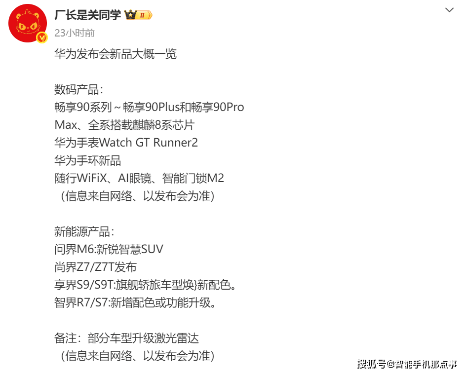 90系列手机打头阵此中包罗华为畅享,新车齐亮相鸿蒙智行,ner 2、AI眼镜、智能门锁M2穿插此中随行WiFi X、Watch GT Run。