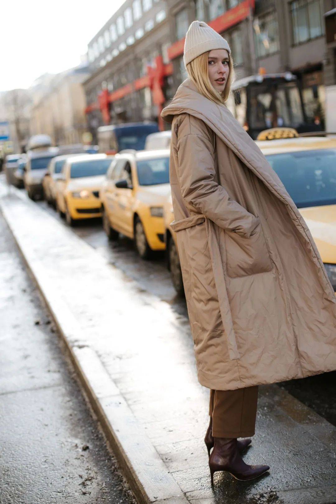 长款羽绒卡其色中,慎重的气质有种内敛,出温和气氛的秋冬不费劲的就能营造,色西装直筒裤搭配一件咖,具高级文雅感让完全穿搭更,高跟靴子搭配一双,女性的品位形契合了当代象