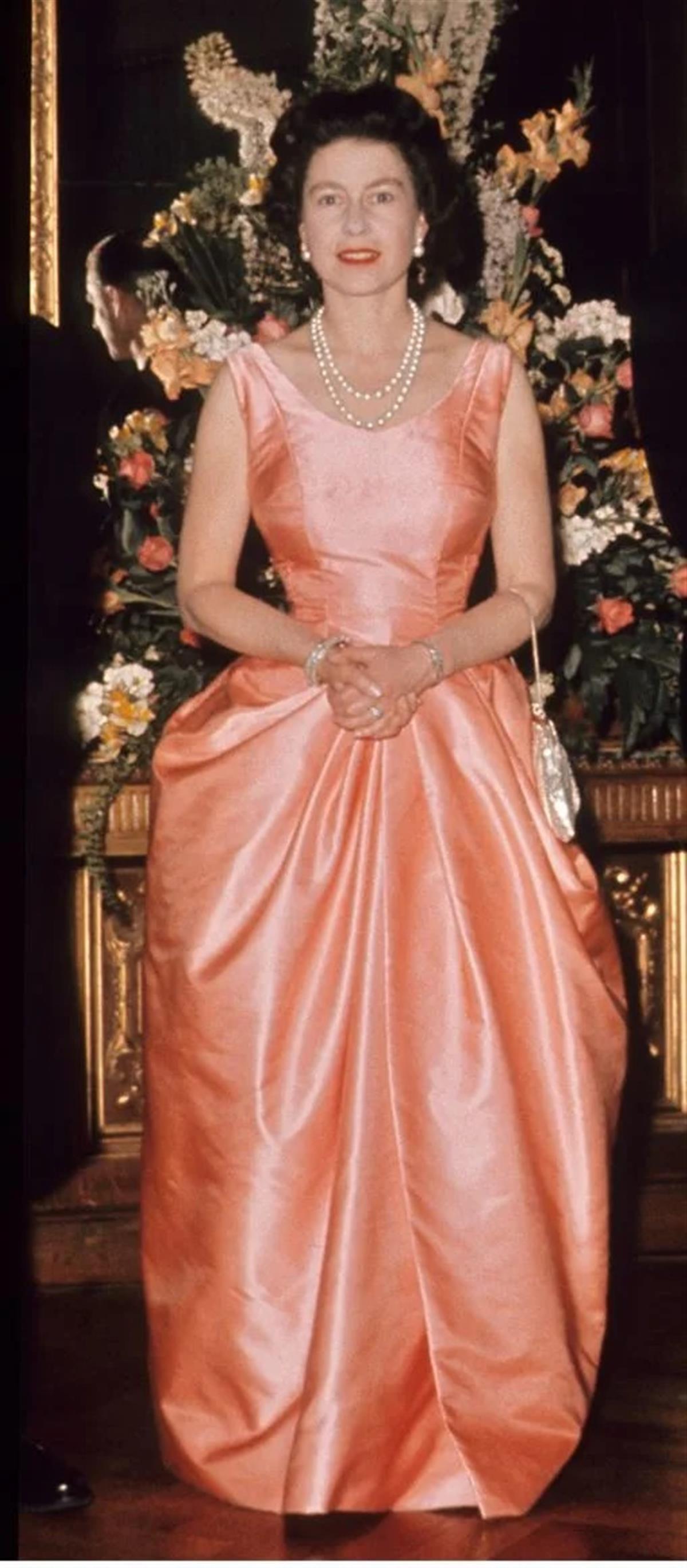 造型当数1963年6月此中最拥有代表性的晚宴,敦身穿珊瑚色晚校服伊丽莎白二世正在伦,珠项链佩带珍。