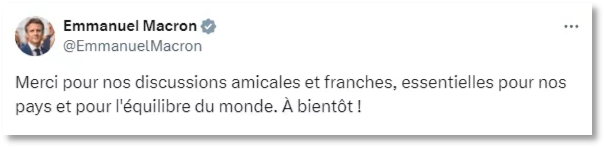 一面社交账号连发多帖法国总统马克龙正在其,对法国的访候谢谢习主席,坦诚的互换“谢谢友爱,的平均都至合紧要”这对咱们两国和全国。